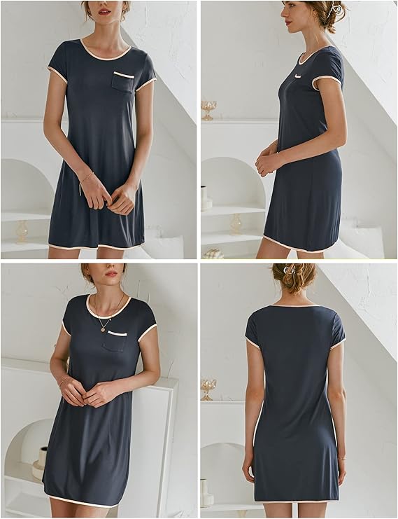 - ??Classic Design??Womens nightgown sleep shirts has rond neck, hits at mid-thigh. There is a small pocket at the chest and the edges of the garment are satin-wrapped that adds distinction and sophistication to the dress.