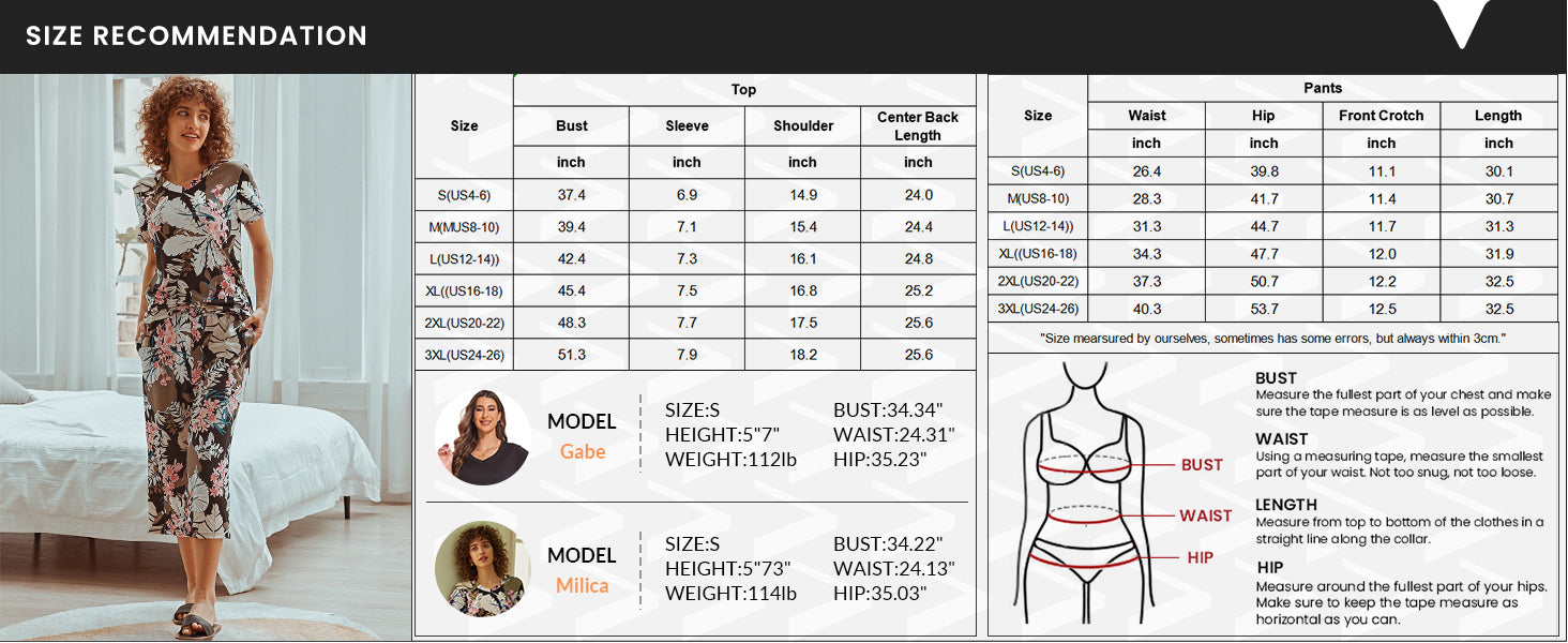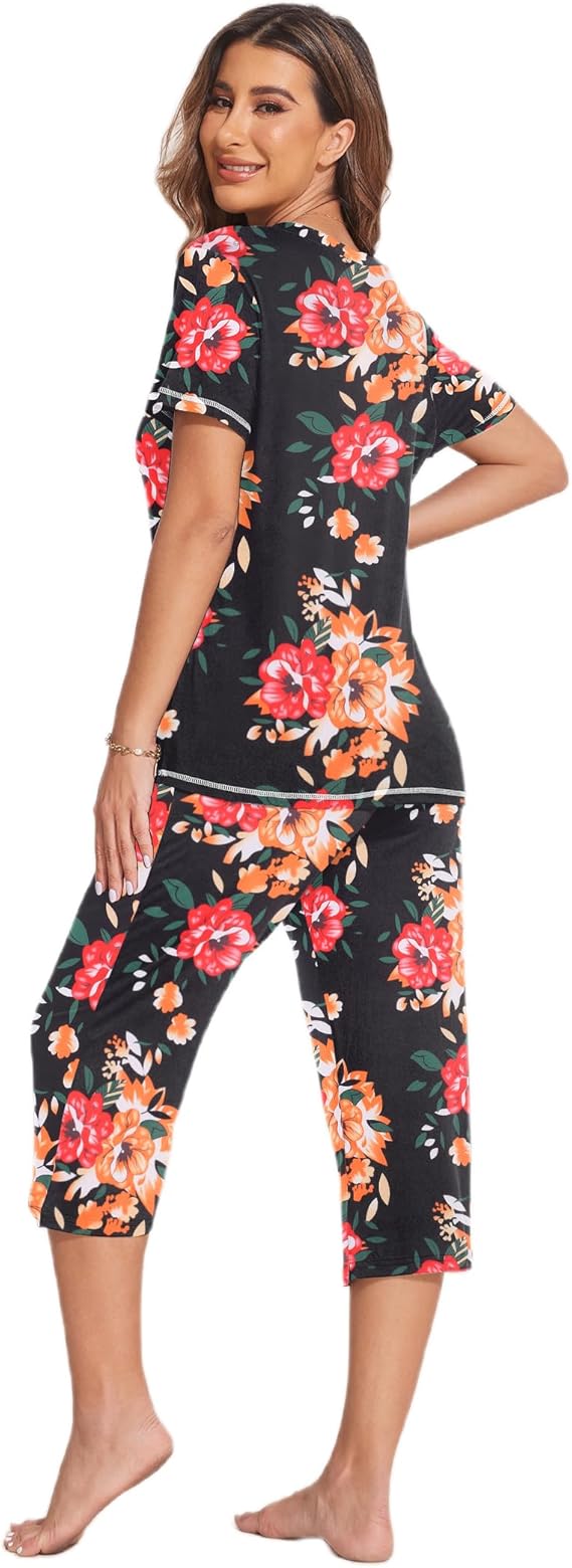 Ekouaer 2 Pack Women's Pajamas Short Sleeve Sleepwear Tops and Capri Pants Pjs