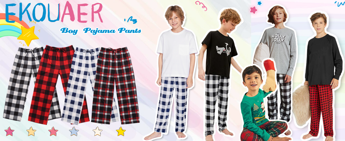 Ekouaer Boys Pajama 3 Pack Sleep Pants - Soft Elastic Waist Kids Plaid Lounge Bottoms With 2 Pockets