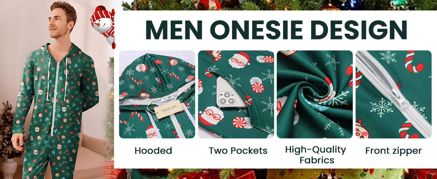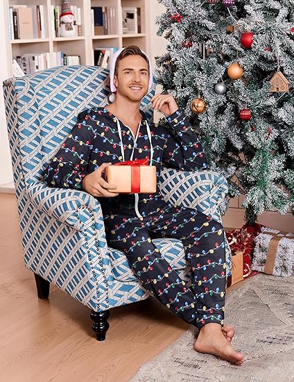 Ekouaer Christmas Onesie for Couples Zipper Hooded Adult Matching Onesie Pajamas with Pockets