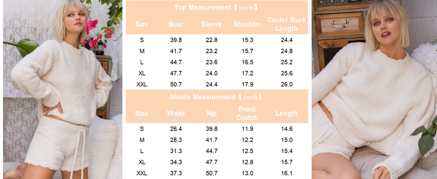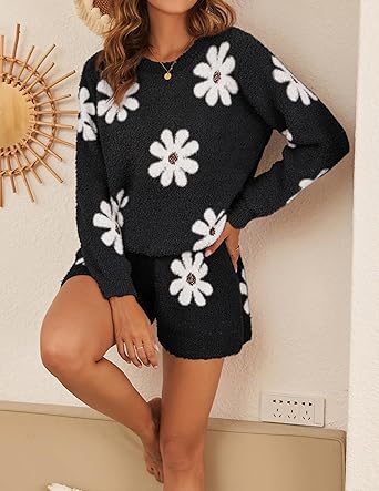 Ekouaer Fuzzy Fleece Pajamas 2 Piece Warm Soft Lounge Set Long Sleeve Sweater Top and Shorts Loungewear Outfits Sweatsuits