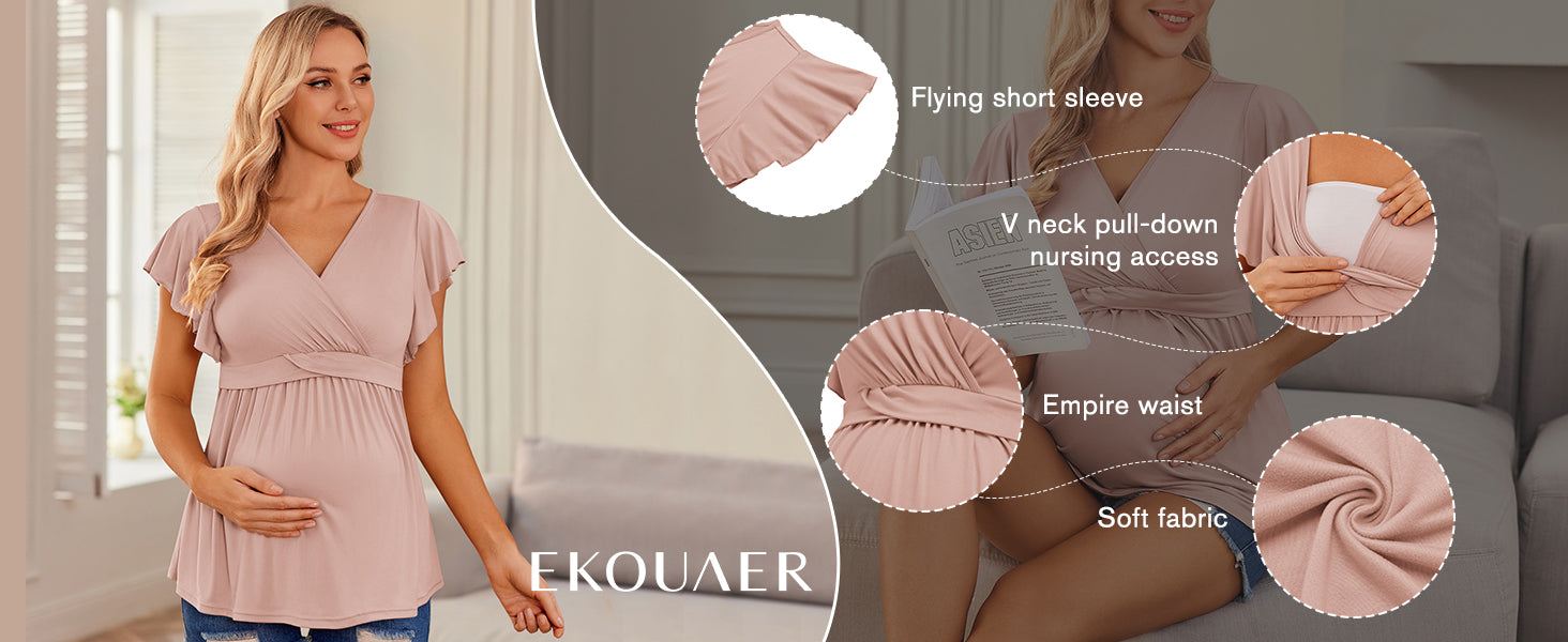 Ekouaer Maternity Shirts 3 Packs Flying Short Sleeve Nursing Tops Pregnancy Clothes Caramel+grey+wine Red L