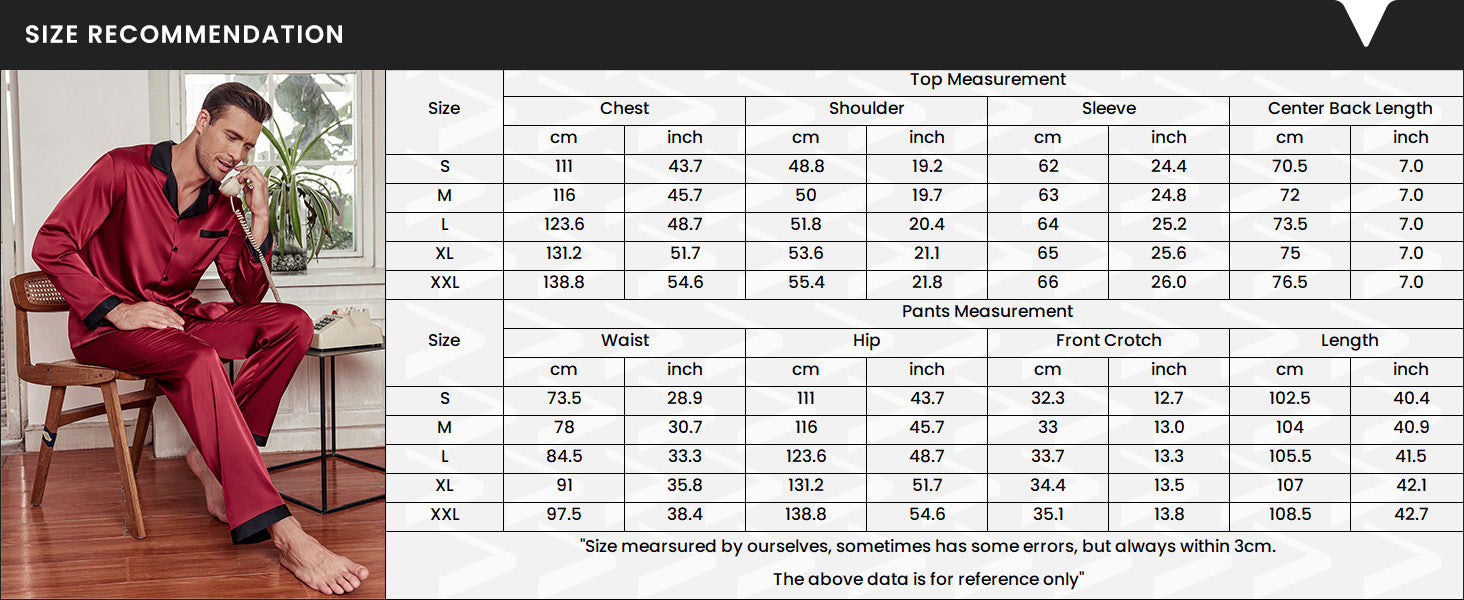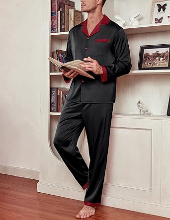 Ekouaer Men's Silk Pajama Set Long Satin Loungewear 2 Piece Pjs Classic Button Down Sleepwear Black Red L