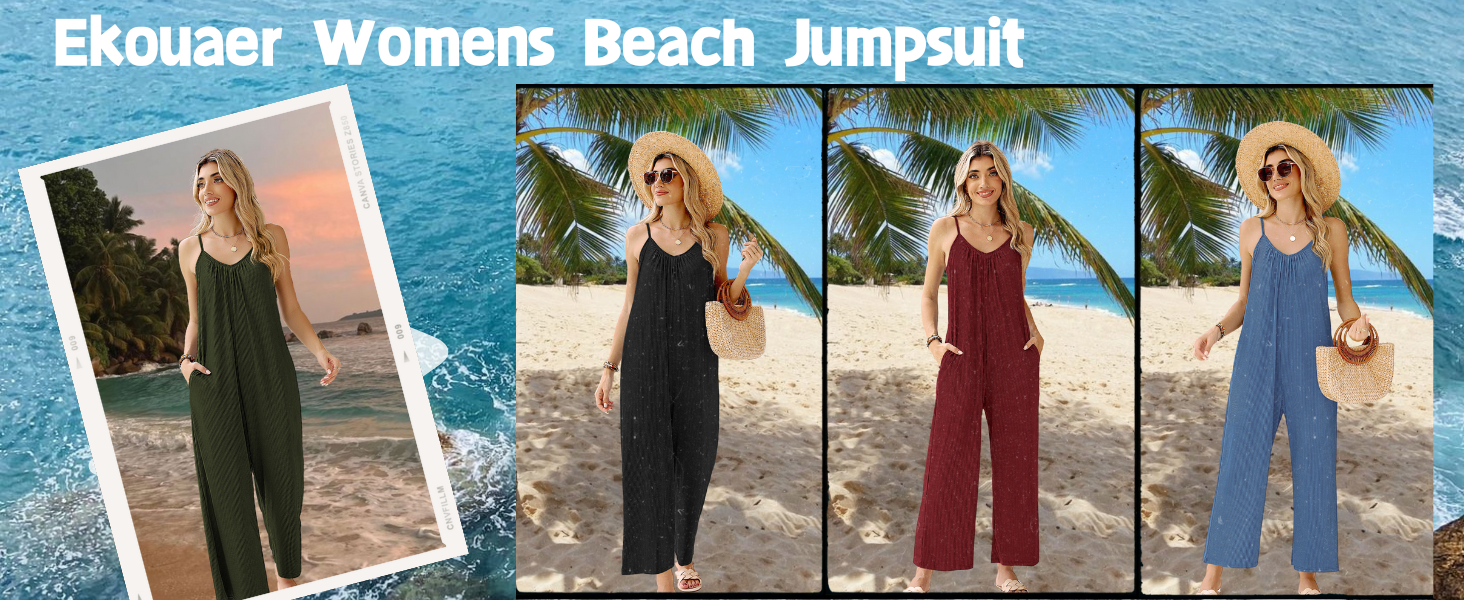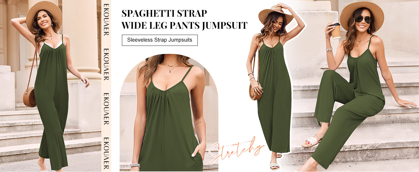 Ekouaer Sleeveless Womens Jumpsuits Ribbed Adjustable Spaghetti Strap Loose Long Pants Romper Jumpsuit