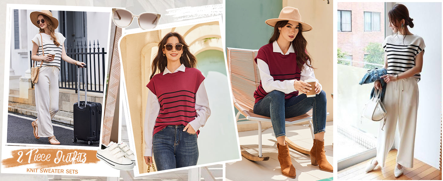 Ekouaer Striped Lounge Set 2 Piece Sweater Matching Outfits Travel Knit Clothing Sets for Women