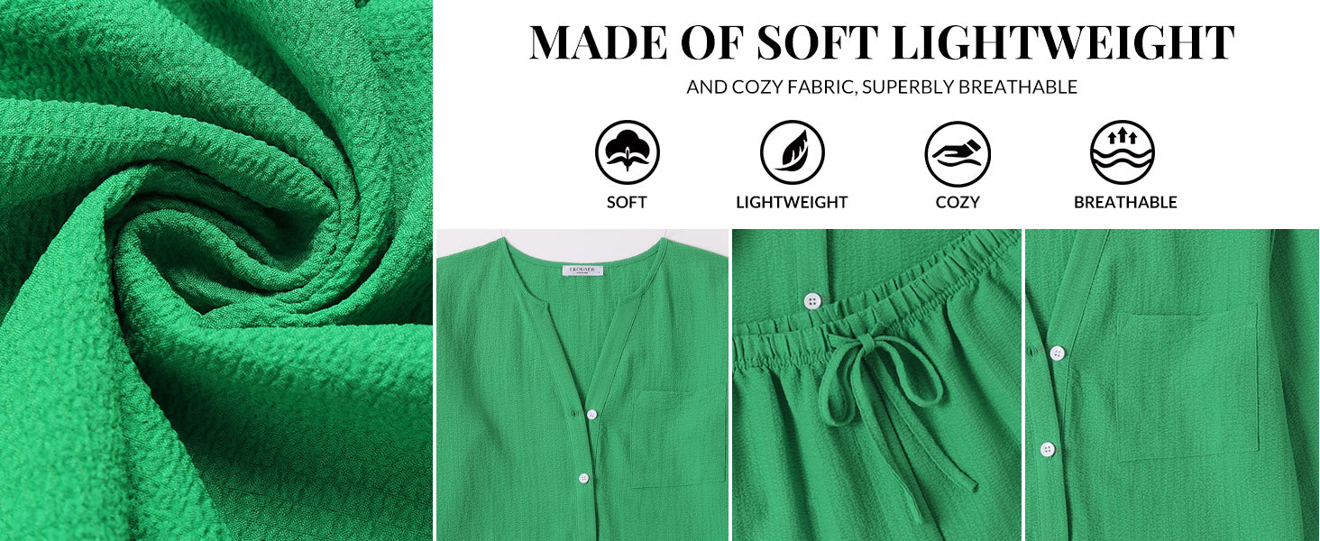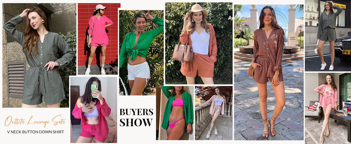 Ekouaer Summer Outfits for Women 2 Piece Sets Lounge Sets V Neck Button Down Shirt and Shorts Loungewear with Pockets