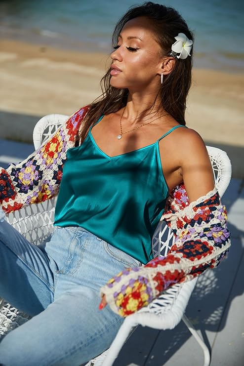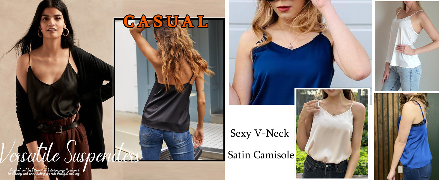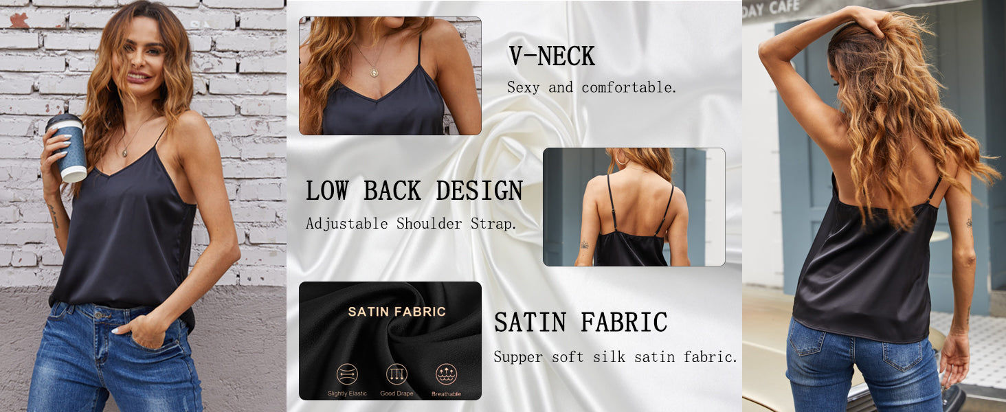 Ekouaer Women's 2 Pcs Satin Camisole Silky Pajama Tank Tops V Neck Soft Spaghetti Strap Loose Basic Sleepwear