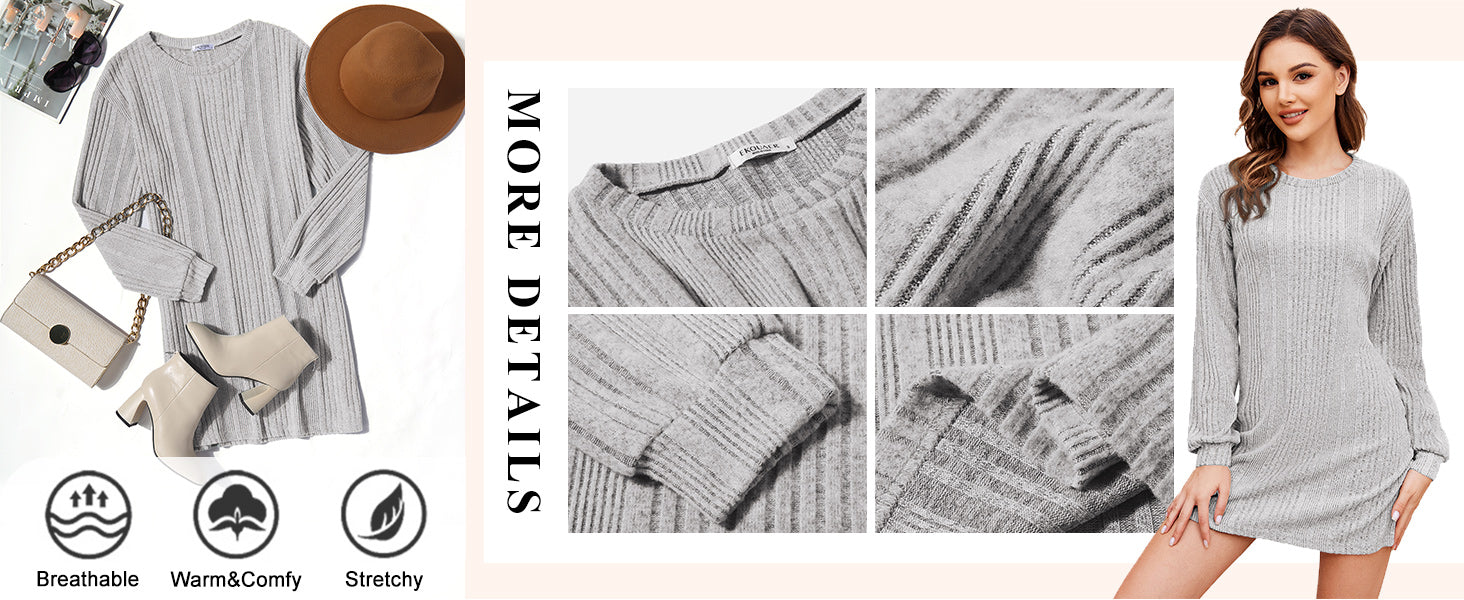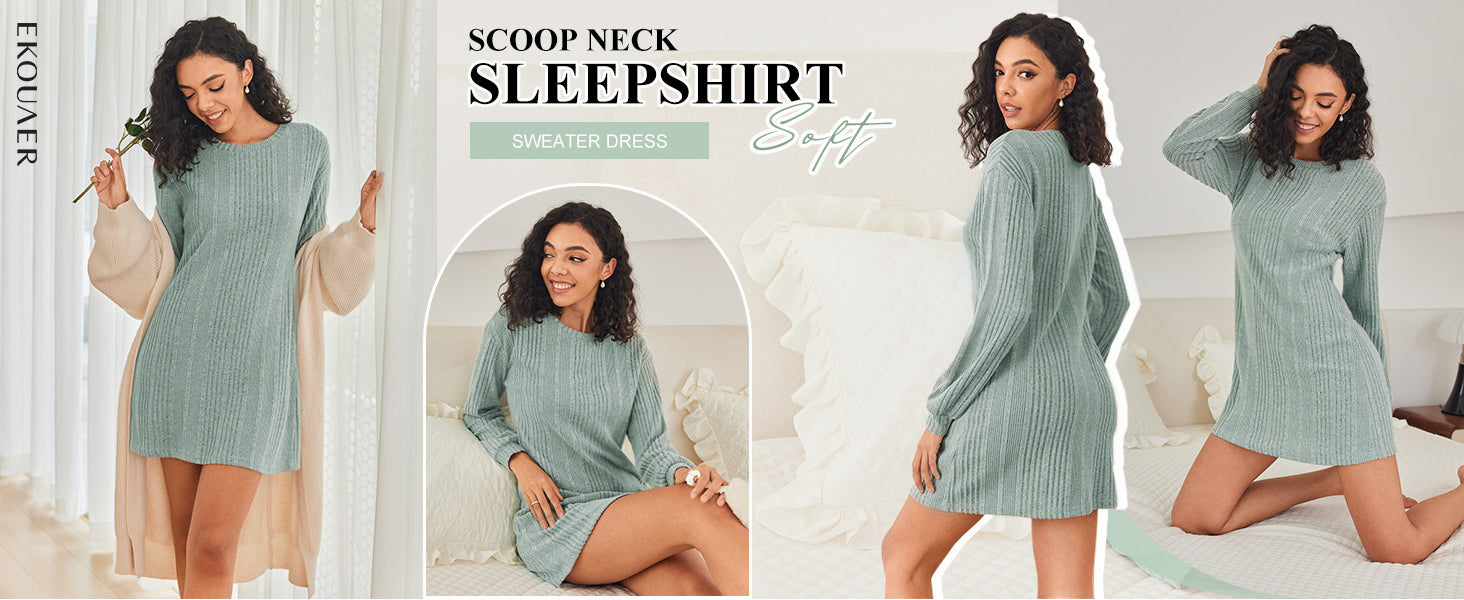 Ekouaer Women's Nightgown Long Sleeve Ribbed Knit Nightshirt Round Neck Sleep Shirt Soft Sweater Dress