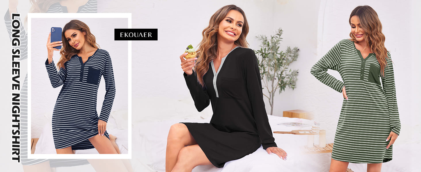 Ekouaer Women's Nightshirt Long Sleeve Button Down Nightgown V-Neck Sleepwear Casual Pajama Dress