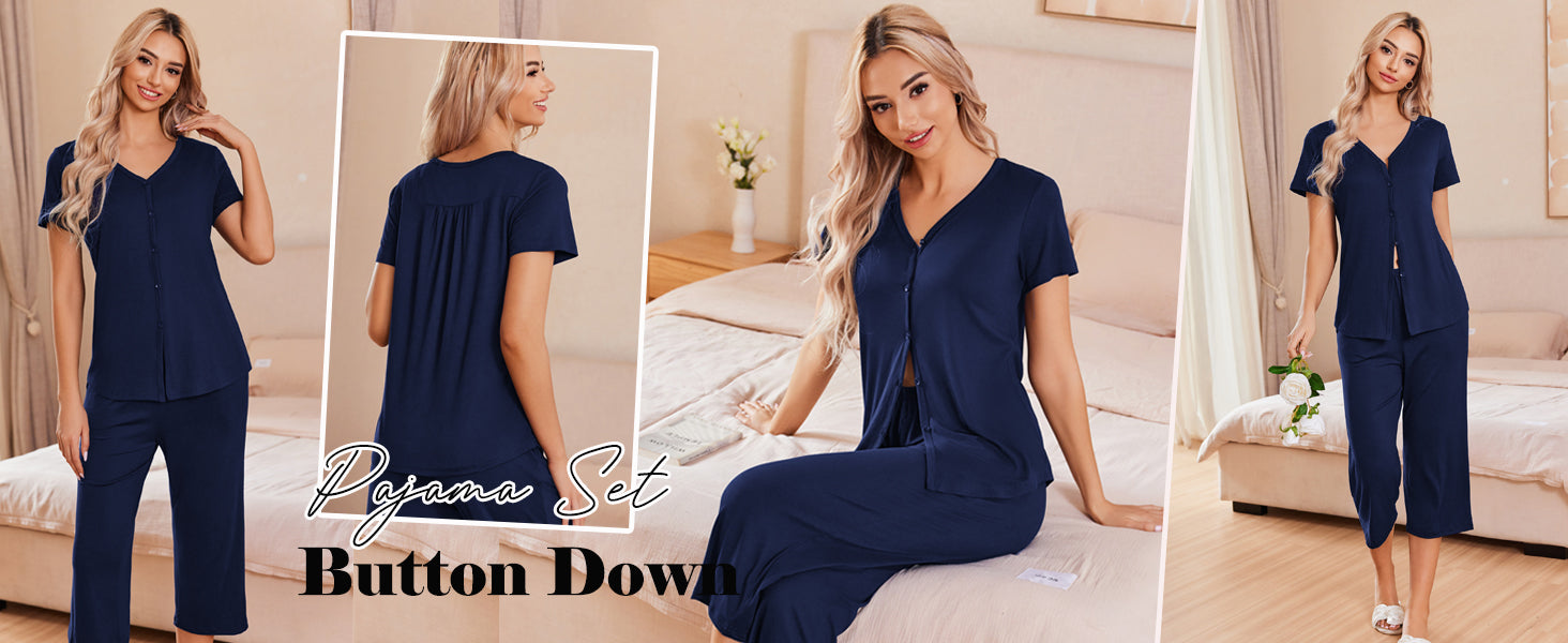 Ekouaer Women's Pajama Sets Short Sleeve Sleepwear Button Up Pj Loungewear Top and Capri Pants with Pockets