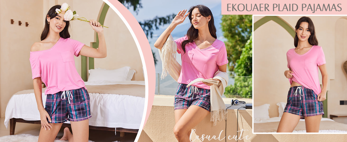 Ekouaer Women's Pajamas Sets Short Sleeve Lounge Sets Sleepwear Casual Two Piece Pjs With Pockets