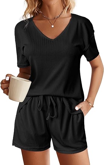 Ekouaer Womens Ribbed Knit Lounge Set Short Sleeve Top and Shorts Sleepwear Pajama Set Two Piece Shorts Outfits Set