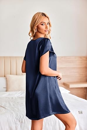 Ekouaer Women's Satin Nightgown Short Sleeve Sleepdress V-Neck Sleepwear Loose Silk Sleepshirt