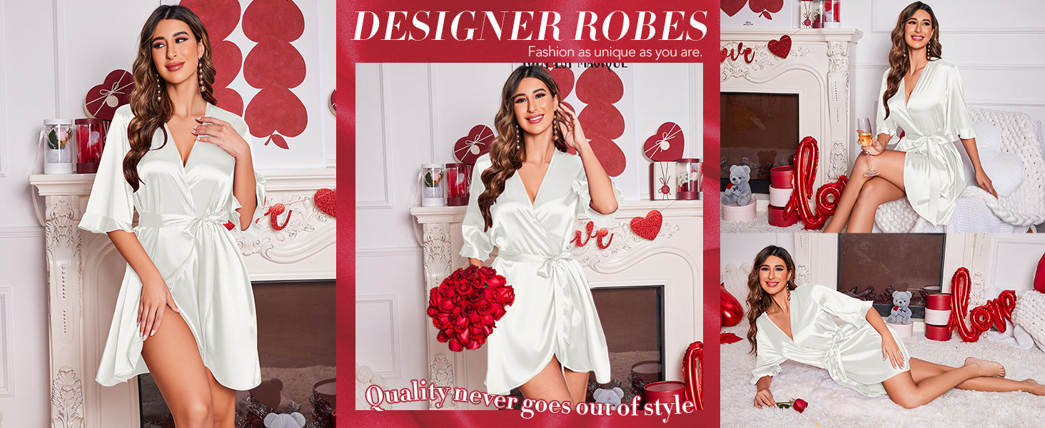Ekouaer Women's Satin Robe Valentines Lingerie for Women Bathrobe Short Ruffle Belted Robes Bridesmaids Sleepwear